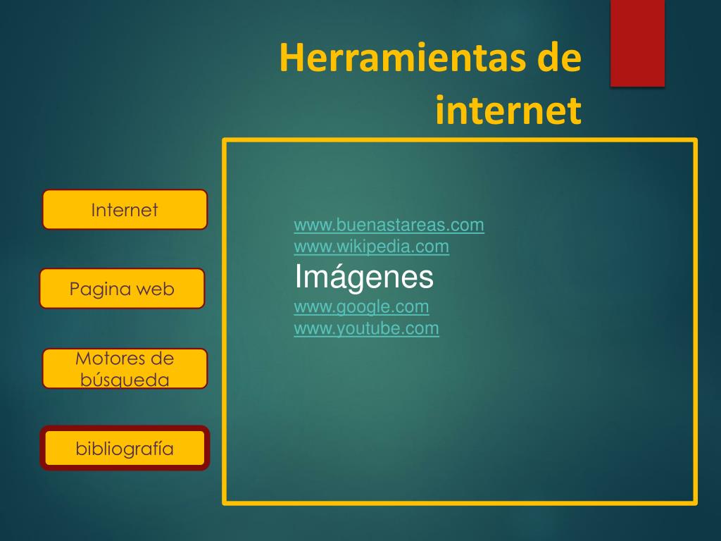Herramientas de internet Internet www.buenastareas.com www.wikipedia.com Imágenes www.google.com www.youtube.com Pagina web Motores de búsqueda bibliografía