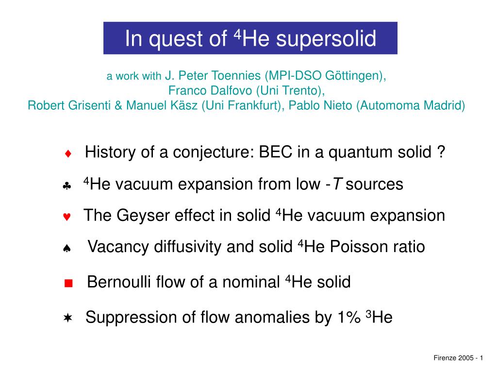 In quest of 4He supersolid a work with J. Peter Toennies (MPI-DSO Göttingen), Franco Dalfovo (Uni Trento), Robert Grisenti & Manuel Käsz (Uni Frankfurt), Pablo Nieto (Automoma Madrid) History of a conjecture: BEC in a quantum solid ? 4He vacuum expansion from low -T sources The Geyser effect in solid 4He vacuum expansion Vacancy diffusivity and solid 4He Poisson ratio Bernoulli flow of a nominal 4He solid Suppression of flow anomalies by 1% 3He Firenze 2005 - 1