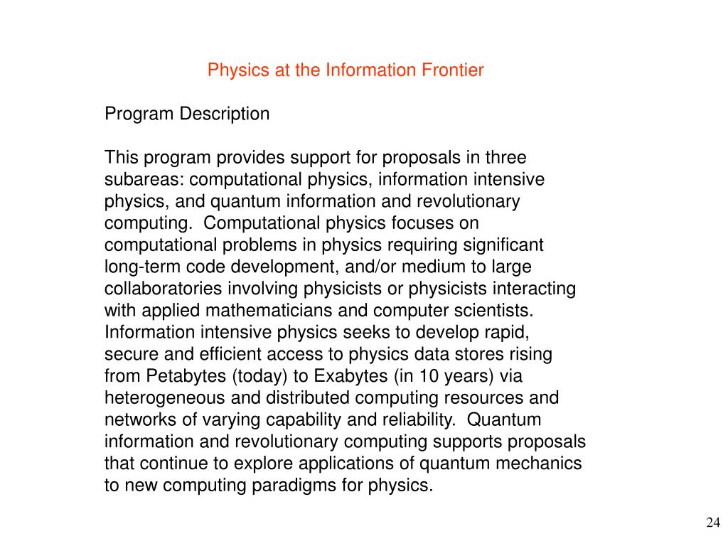 Physics at the Information Frontier Program Description This program provides support for proposals in three subareas: computational physics, information intensive physics, and quantum information and revolutionary computing. Computational physics focuses on computational problems in physics requiring significant long-term code development, and/or medium to large collaboratories involving physicists or physicists interacting with applied mathematicians and computer scientists. Information intensive physics seeks to develop rapid, secure and efficient access to physics data stores rising from Petabytes (today) to Exabytes (in 10 years) via heterogeneous and distributed computing resources and networks of varying capability and reliability. Quantum information and revolutionary computing supports proposals that continue to explore applications of quantum mechanics to new computing paradigms for physics.