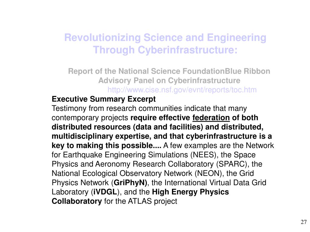 Revolutionizing Science and Engineering Through Cyberinfrastructure: • Report of the National Science FoundationBlue Ribbon Advisory Panel on Cyberinfrastructure • http://www.cise.nsf.gov/evnt/reports/toc.htm • Executive Summary Excerpt • Testimony from research communities indicate that many contemporary projects require effective federation of both distributed resources (data and facilities) and distributed, multidisciplinary expertise, and that cyberinfrastructure is a key to making this possible.... A few examples are the Network for Earthquake Engineering Simulations (NEES), the Space Physics and Aeronomy Research Collaboratory (SPARC), the National Ecological Observatory Network (NEON), the Grid Physics Network (GriPhyN), the International Virtual Data Grid Laboratory (iVDGL), and the High Energy Physics Collaboratory for the ATLAS project