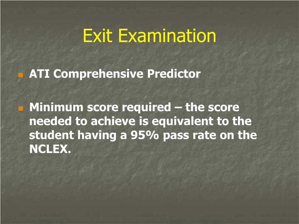 Exit Examination • ATI Comprehensive Predictor • Minimum score required – the score needed to achieve is equivalent to the student having a 95% pass rate on the NCLEX.