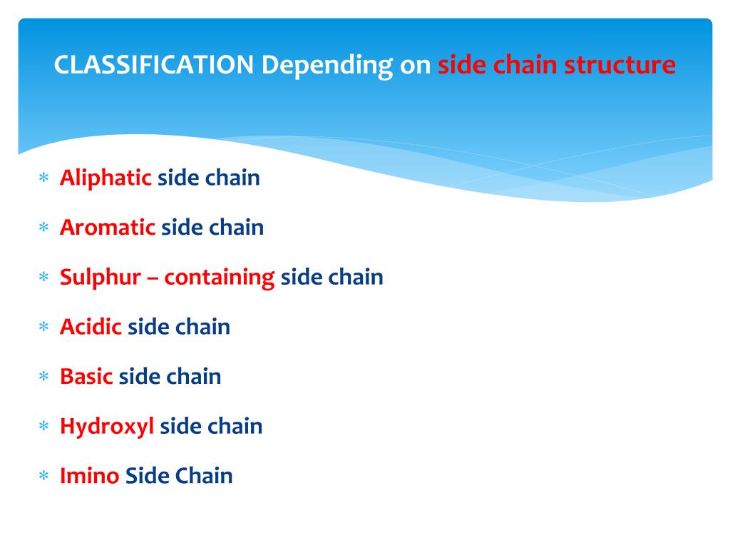 CLASSIFICATIONDepending on side chain structure Aliphatic side chain Aromaticside chain Sulphur – containing side chain Acidicside chain Basicside chain Hydroxyl side chain Imino Side Chain
