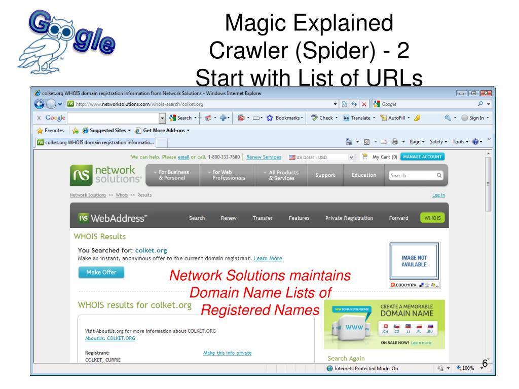Magic ExplainedCrawler (Spider) - 2Start with List of URLs Network Solutions maintains Domain Name Lists of Registered Names