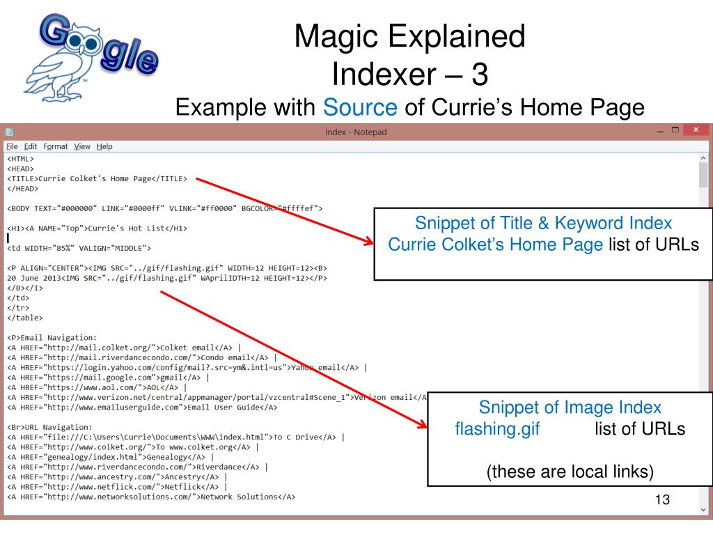 Magic Explained Indexer – 3Example with Source of Currie’s Home Page Snippet of Title & Keyword Index Currie Colket’s Home Page list of URLs Snippet of Image Index flashing.gif list of URLs (these are local links)