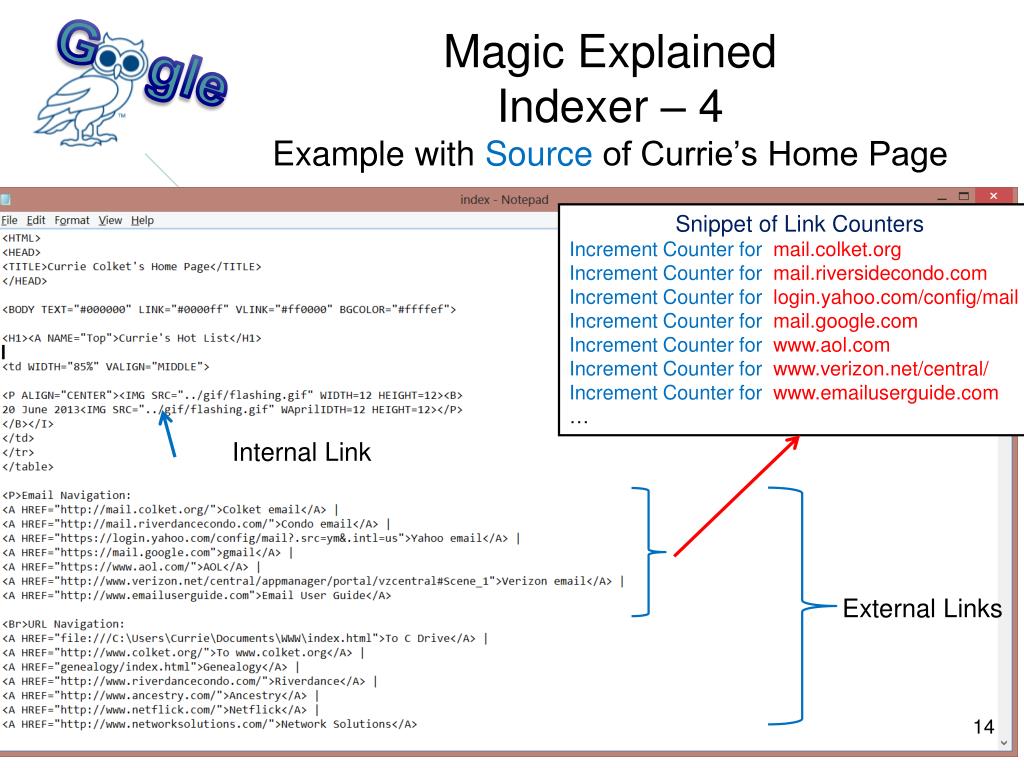 Magic Explained Indexer – 4Example with Source of Currie’s Home Page Snippet of Link Counters Increment Counter for mail.colket.org Increment Counter for mail.riversidecondo.com Increment Counter for login.yahoo.com/config/mail Increment Counter for mail.google.com Increment Counter for www.aol.com Increment Counter for www.verizon.net/central/ Increment Counter for www.emailuserguide.com … Internal Link External Links