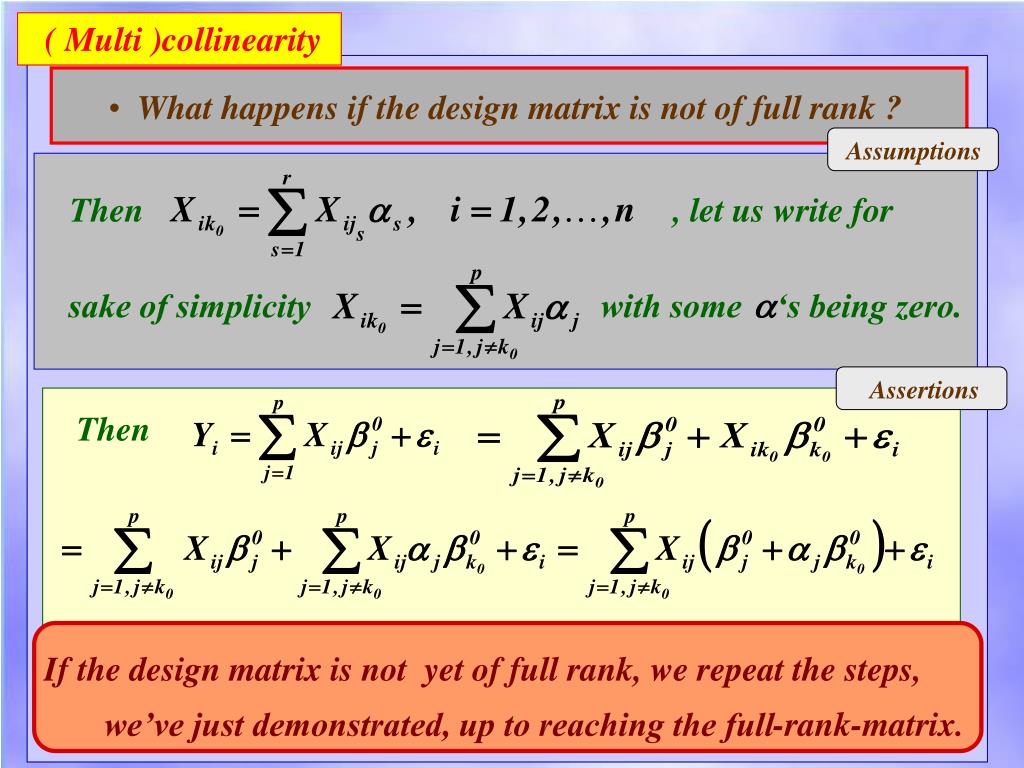 ( Multi )collinearity • What happens if the design matrix is not of full rank ? Assumptions Then , let us write for sake of simplicity with some ‘s being zero. Assertions Then If the design matrix is not yet of full rank, we repeat the steps, we’ve just demonstrated, up to reaching the full-rank-matrix.