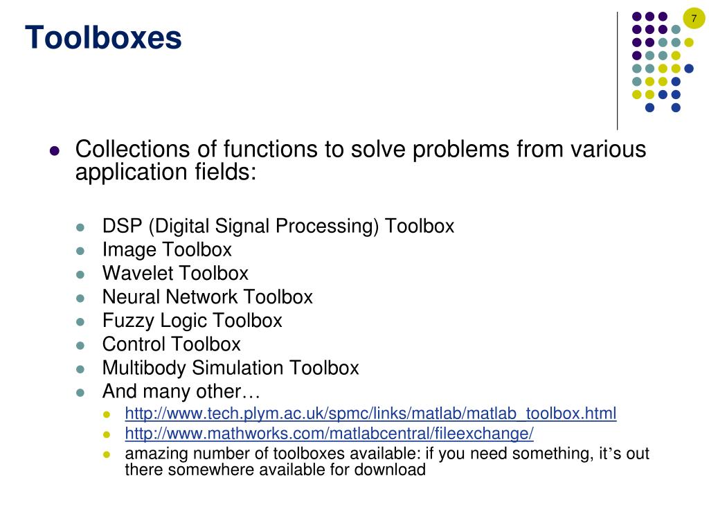 Toolboxes • Collections of functions to solve problems from various application fields: • DSP (Digital Signal Processing) Toolbox • Image Toolbox • Wavelet Toolbox • Neural Network Toolbox • Fuzzy Logic Toolbox • Control Toolbox • Multibody Simulation Toolbox • And many other… • http://www.tech.plym.ac.uk/spmc/links/matlab/matlab_toolbox.html • http://www.mathworks.com/matlabcentral/fileexchange/ • amazing number of toolboxes available: if you need something, it’s out there somewhere available for download