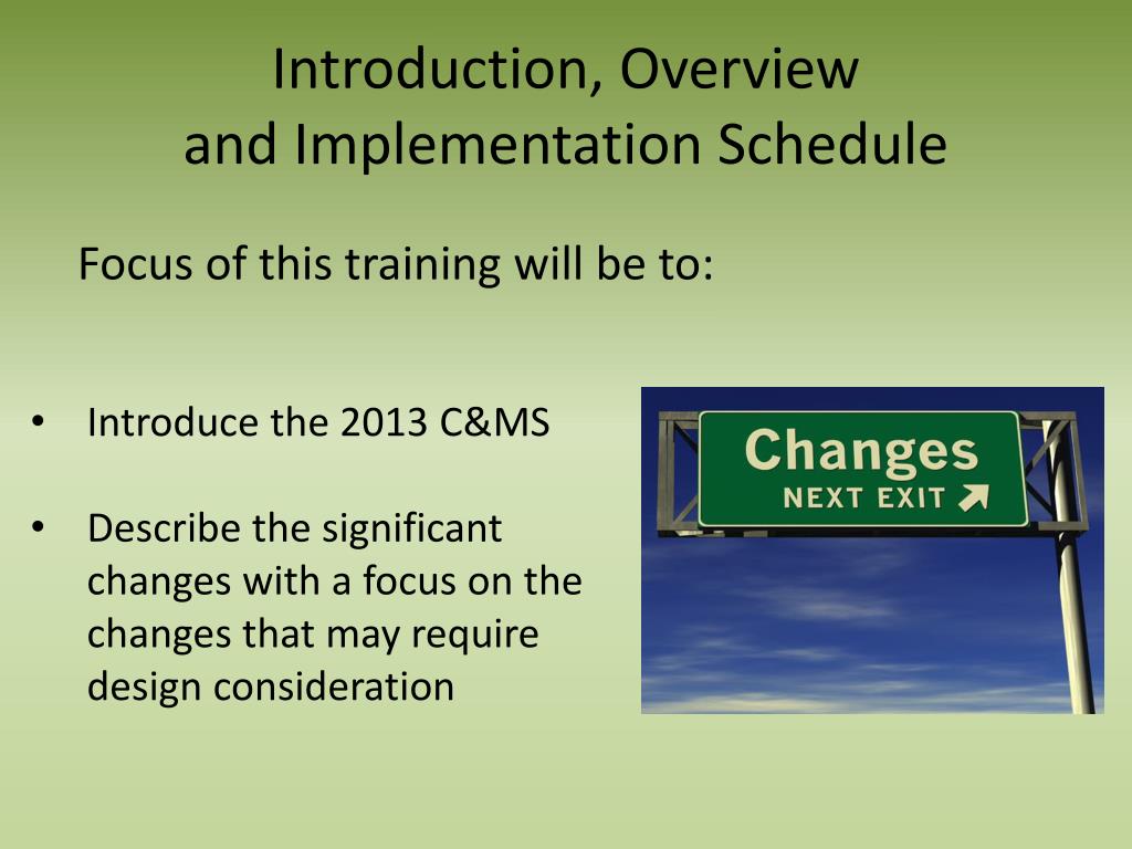 Introduction, Overview and Implementation Schedule Focus of this training will be to: • Introduce the 2013 C&MS • Describe the significant changes with a focus on the changes that may require design consideration