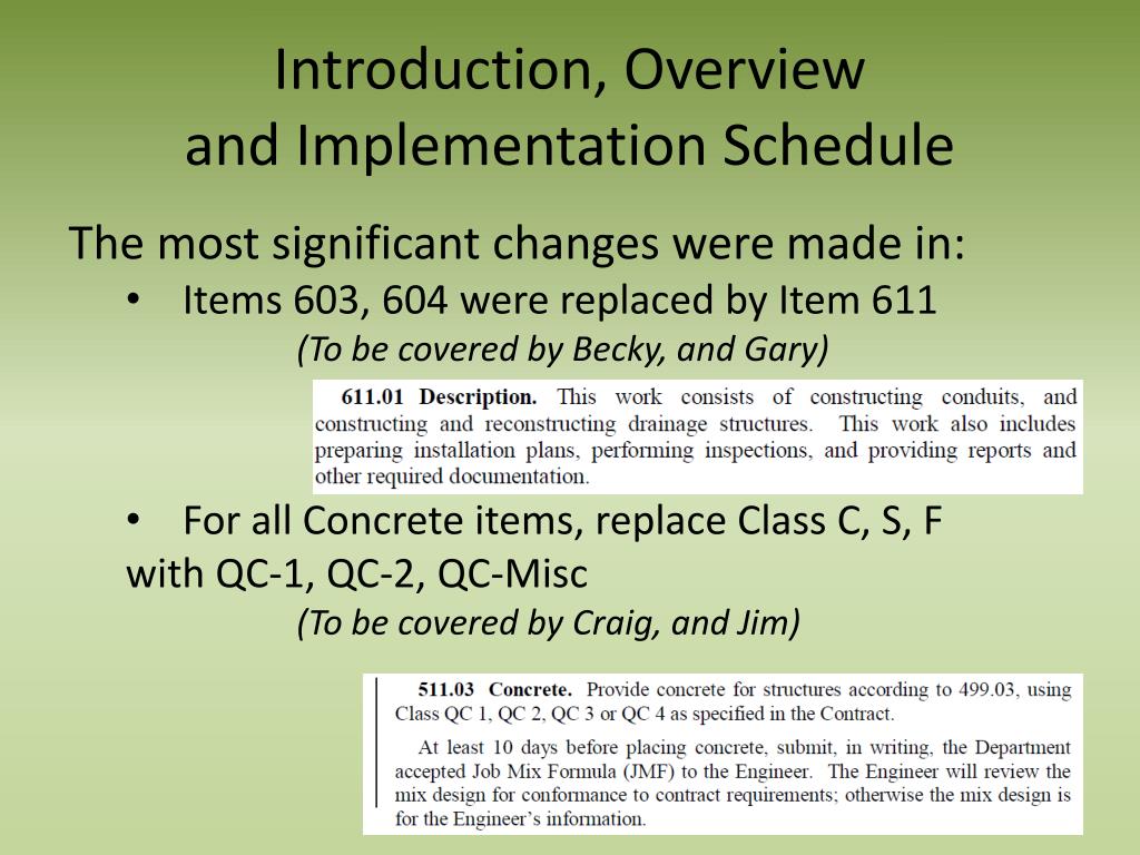 Introduction, Overview and Implementation Schedule • The most significant changes were made in: • Items 603, 604 were replaced by Item 611 • (To be covered by Becky, and Gary) • For all Concrete items, replace Class C, S, F • with QC-1, QC-2, QC-Misc • (To be covered by Craig, and Jim)