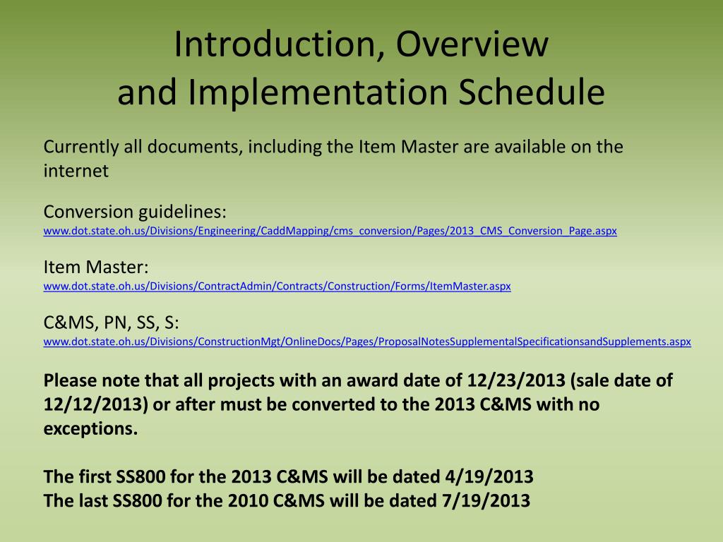 Introduction, Overview and Implementation Schedule Currently all documents, including the Item Master are available on the internet Conversion guidelines: www.dot.state.oh.us/Divisions/Engineering/CaddMapping/cms_conversion/Pages/2013_CMS_Conversion_Page.aspx Item Master: www.dot.state.oh.us/Divisions/ContractAdmin/Contracts/Construction/Forms/ItemMaster.aspx C&MS, PN, SS, S: www.dot.state.oh.us/Divisions/ConstructionMgt/OnlineDocs/Pages/ProposalNotesSupplementalSpecificationsandSupplements.aspx Please note that all projects with an award date of 12/23/2013 (sale date of 12/12/2013) or after must be converted to the 2013 C&MS with no exceptions. The first SS800 for the 2013 C&MS will be dated 4/19/2013 The last SS800 for the 2010 C&MS will be dated 7/19/2013