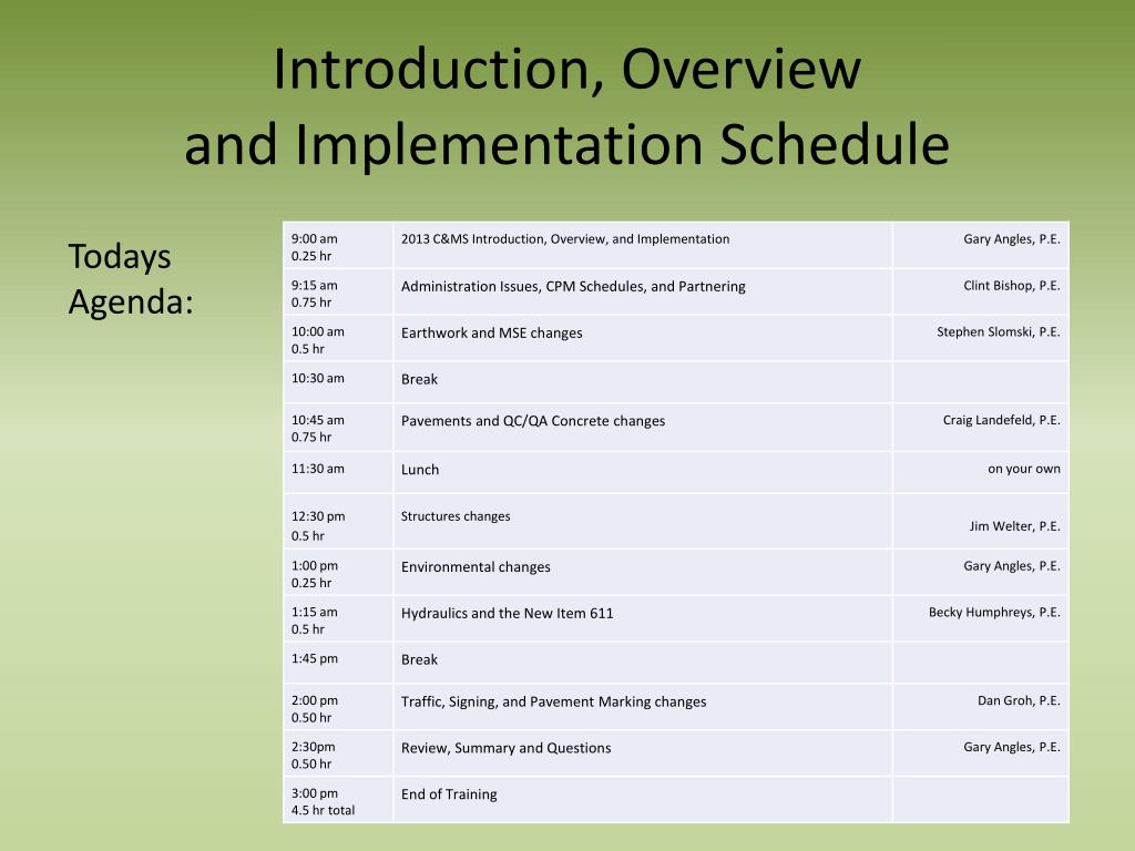 Training for the 2013 Construction and Material Specifications. Office of Construction Administration Gary Angles, Administrator. Introduction, Overview and Implementation Schedule. Focus of this training will be to:. Introduce the 2013 C&MS