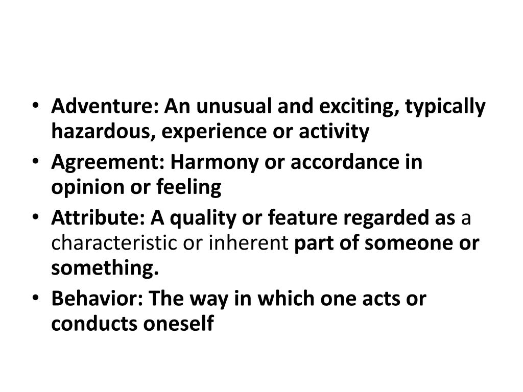 Adventure: An unusual and exciting, typically hazardous, experience or activity • Agreement: Harmony or accordance in opinion or feeling • Attribute: A quality or feature regarded as a characteristic or inherent part of someone or something. • Behavior: The way in which one acts or conducts oneself