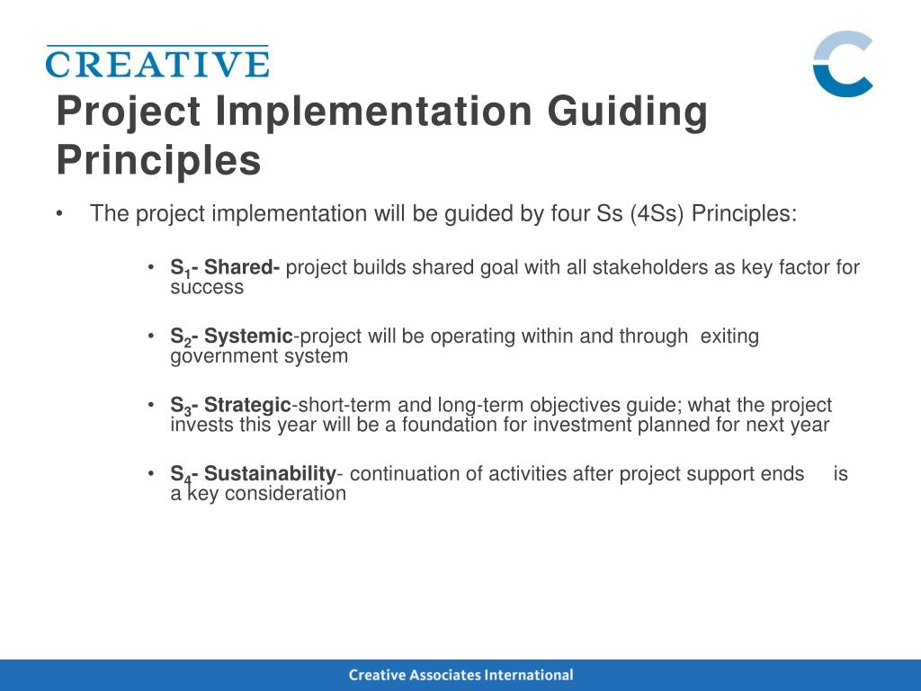 Project Implementation Guiding Principles • The project implementation will be guided by four Ss (4Ss) Principles: • S1- Shared- project builds shared goal with all stakeholders as key factor for success • S2- Systemic-project will be operating within and through exiting government system • S3- Strategic-short-term and long-term objectives guide; what the project invests this year will be a foundation for investment planned for next year • S4- Sustainability- continuation of activities after project support ends is a key consideration