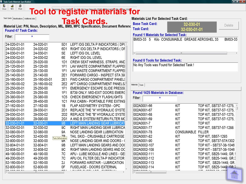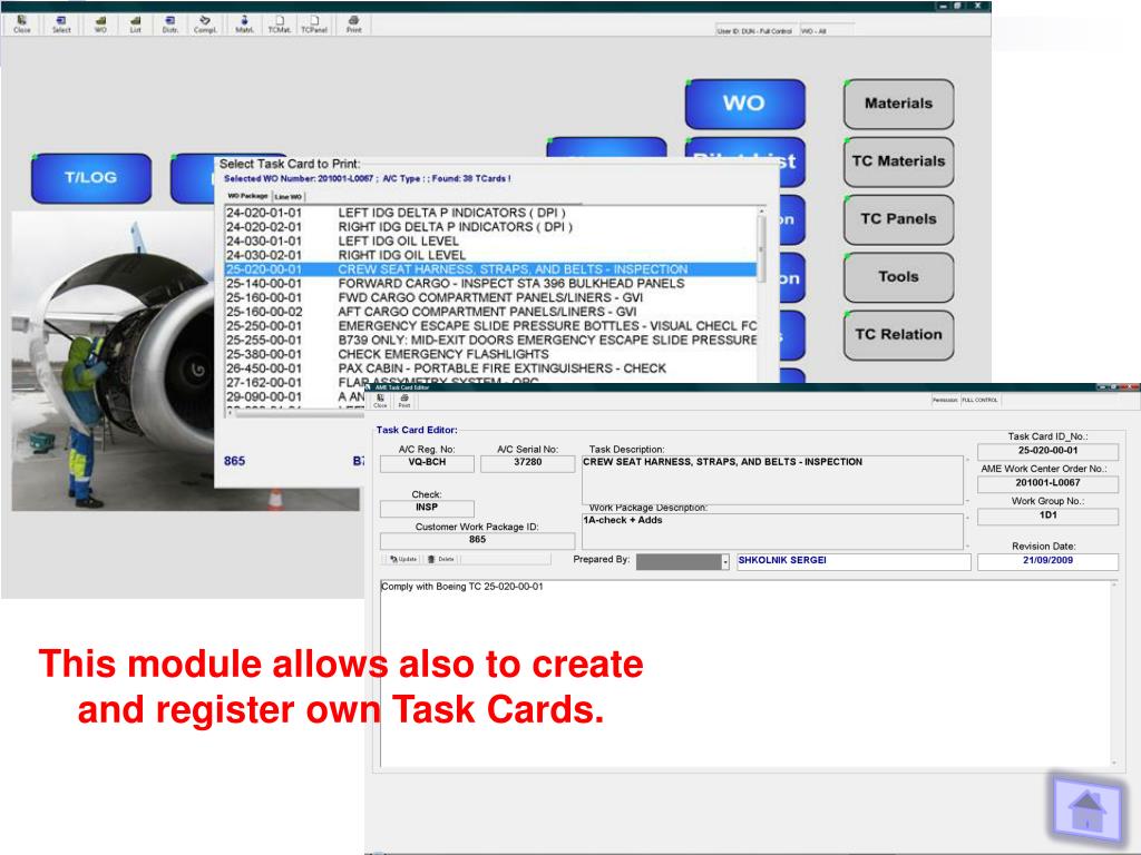 Work order Registration Pilot List Distribution Completion Task Cards Materials Man Hours Aircraft Times Shortage Form Task Cards History Technical Log NRC Registration Reports LINE MAINTENANCE MODULE INCLUDES: