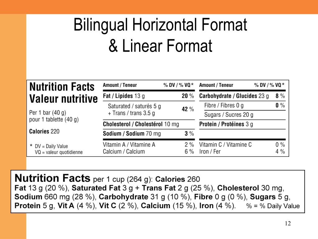 Bilingual Labelling • *Bilingual Labelling is not required for; • Products packaged and sold at the retail store. • Packaged products (including those manufacturered by a retailer) when sold only in the local government unit where the product was manufactured and in any immediately adjacent local government unit. (e.g., city, municipality etc.) • *On the assumption the second official language is the mother tongue of the less than 10% of the population.