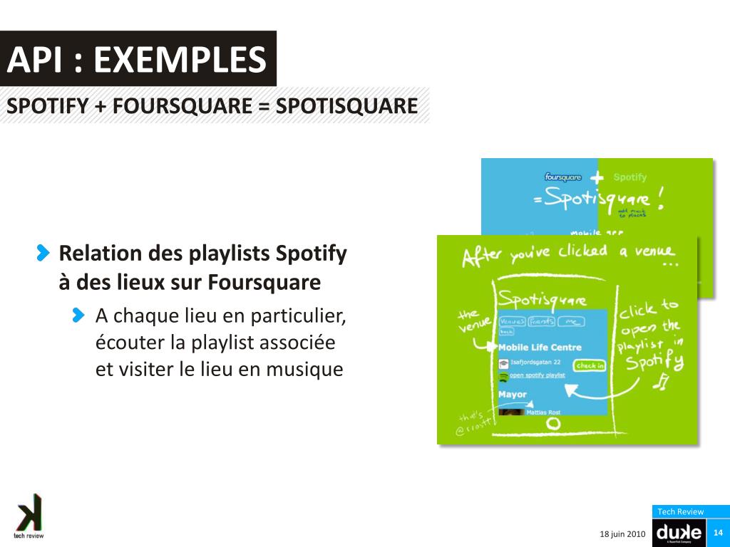 API : exemples Spotify+ Foursquare = Spotisquare Relation des playlistsSpotifyà des lieux sur Foursquare • A chaque lieu en particulier, écouter la playlist associée et visiter le lieu en musique