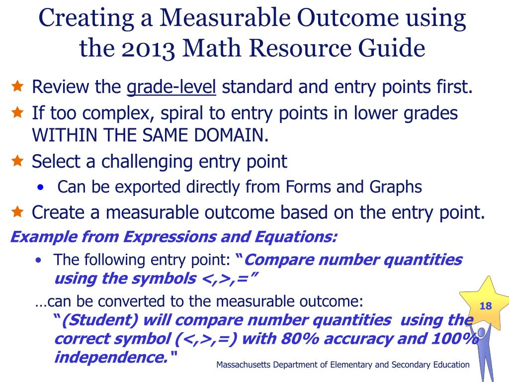 Creating a Measurable Outcome using the 2013 Math Resource Guide • Review the grade-level standard and entry points first. • If too complex, spiral to entry points in lower grades WITHIN THE SAME DOMAIN. • Select a challenging entry point • Can be exported directly from Forms and Graphs • Create a measurable outcome based on the entry point. Example from Expressions and Equations: • The following entry point: “Compare number quantities using the symbols <,>,=” …can be converted to the measurable outcome: “(Student) will compare number quantities using the correct symbol (<,>,=) with 80% accuracy and 100% independence.“ Massachusetts Department of Elementary and Secondary Education