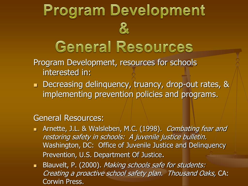 Program Development&General Resources • Program Development, resources for schools interested in: • Decreasing delinquency, truancy, drop-out rates, & implementing prevention policies and programs. • General Resources: • Arnette, J.L. & Walsleben, M.C. (1998). Combating fear and restoring safety in schools: A juvenile justice bulletin. Washington, DC: Office of Juvenile Justice and Delinquency Prevention, U.S. Department Of Justice. • Blauvelt, P. (2000). Making schools safe for students: Creating a proactive school safety plan. Thousand Oaks, CA: Corwin Press.