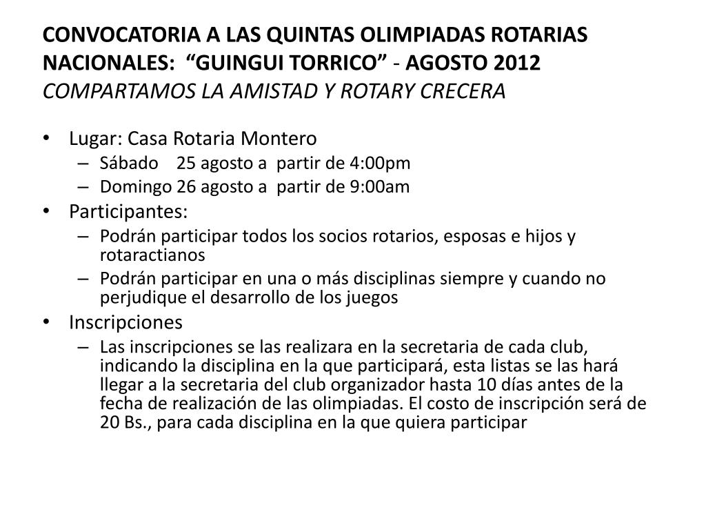 CONVOCATORIA A LAS QUINTAS OLIMPIADAS ROTARIAS NACIONALES: “GUINGUI TORRICO” - AGOSTO 2012COMPARTAMOS LA AMISTAD Y ROTARY CRECERA • Lugar: Casa Rotaria Montero • Sábado 25 agosto a partir de 4:00pm • Domingo 26 agosto a partir de 9:00am • Participantes: • Podrán participar todos los socios rotarios, esposas e hijos y rotaractianos • Podrán participar en una o más disciplinas siempre y cuando no perjudique el desarrollo de los juegos • Inscripciones • Las inscripciones se las realizara en la secretaria de cada club, indicando la disciplina en la que participará, esta listas se las hará llegar a la secretaria del club organizador hasta 10 días antes de la fecha de realización de las olimpiadas. El costo de inscripción será de 20 Bs., para cada disciplina en la que quiera participar