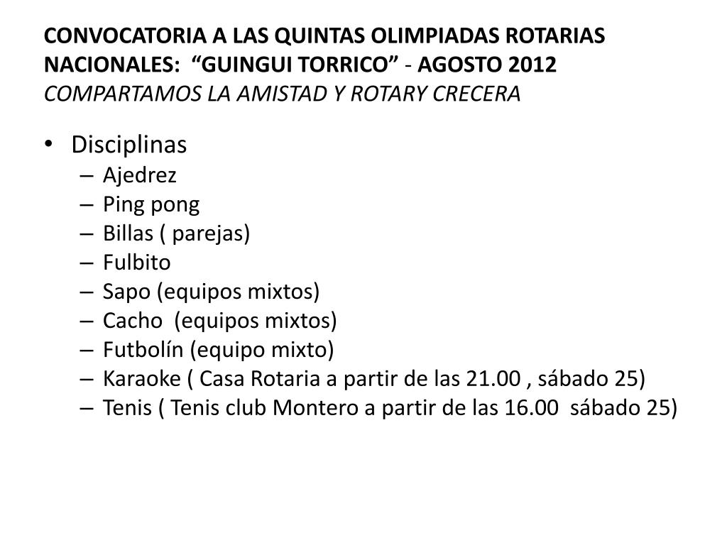 CONVOCATORIA A LAS QUINTAS OLIMPIADAS ROTARIAS NACIONALES: “GUINGUI TORRICO” - AGOSTO 2012COMPARTAMOS LA AMISTAD Y ROTARY CRECERA • Disciplinas • Ajedrez • Pingpong • Billas ( parejas) • Fulbito • Sapo (equipos mixtos) • Cacho (equipos mixtos) • Futbolín (equipo mixto) • Karaoke ( Casa Rotaria a partir de las 21.00 , sábado 25) • Tenis ( Tenis club Montero a partir de las 16.00 sábado 25)
