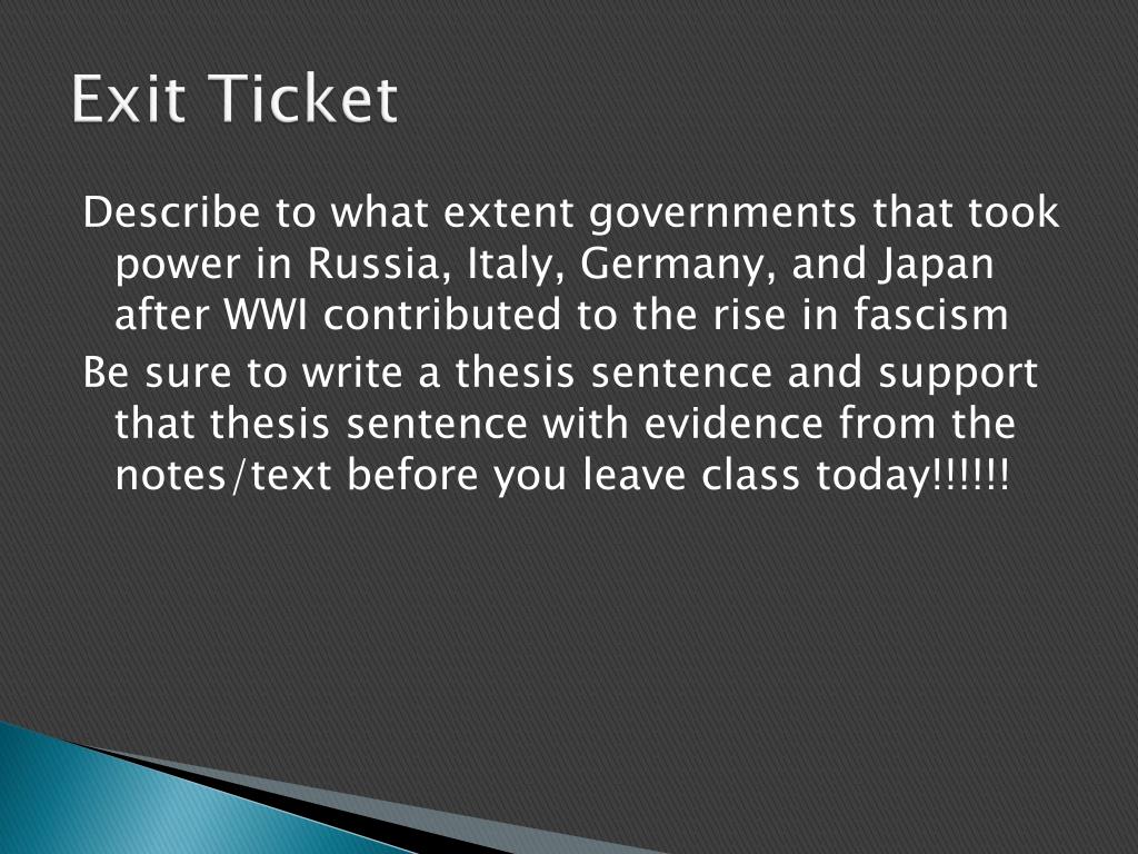 Exit Ticket Describe to what extent governments that took power in Russia, Italy, Germany, and Japan after WWI contributed to the rise in fascism Be sure to write a thesis sentence and support that thesis sentence with evidence from the notes/text before you leave class today!!!!!!
