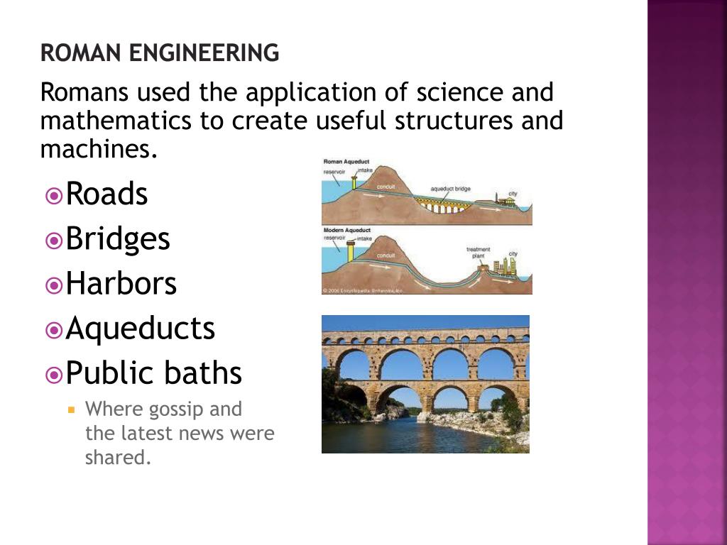Roman engineering Romans used the application of science and mathematics to create useful structures and machines. • Roads • Bridges • Harbors • Aqueducts • Public baths • Where gossip and the latest news were shared.