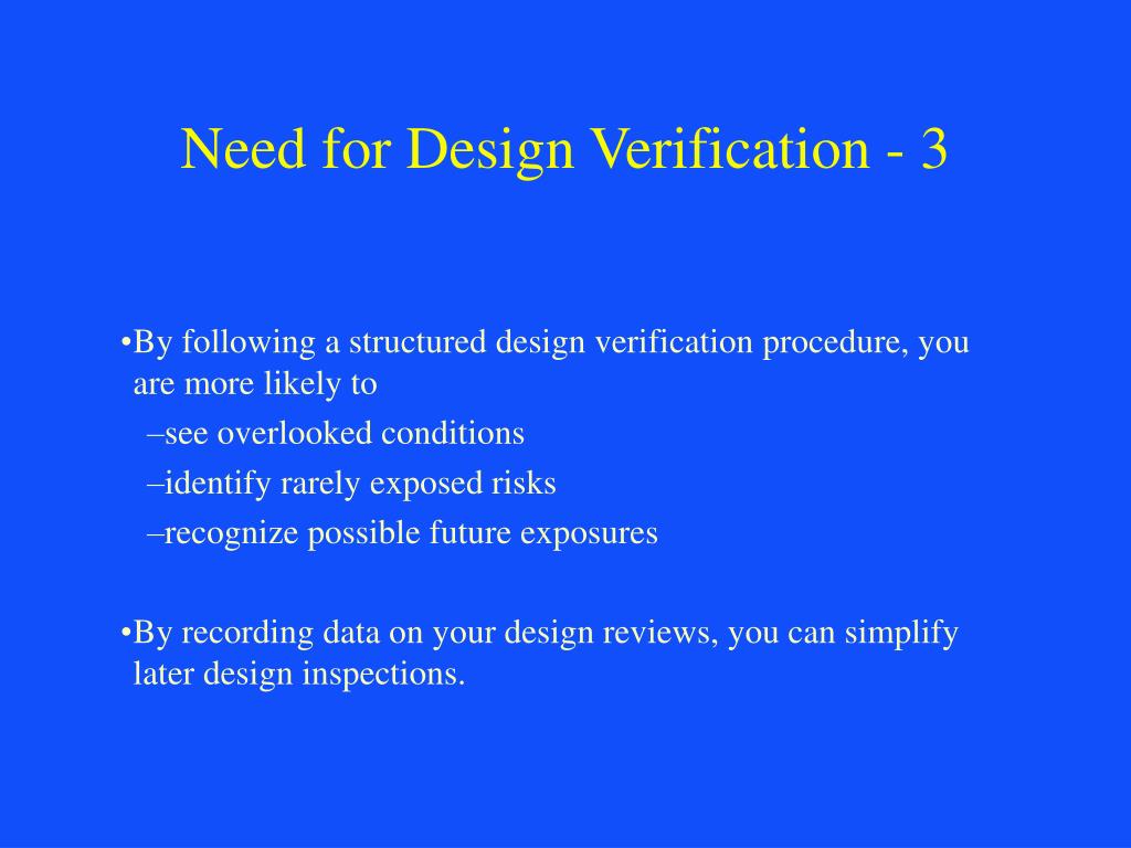 Need for Design Verification - 3 • By following a structured design verification procedure, you are more likely to • see overlooked conditions • identify rarely exposed risks • recognize possible future exposures • By recording data on your design reviews, you can simplify later design inspections.