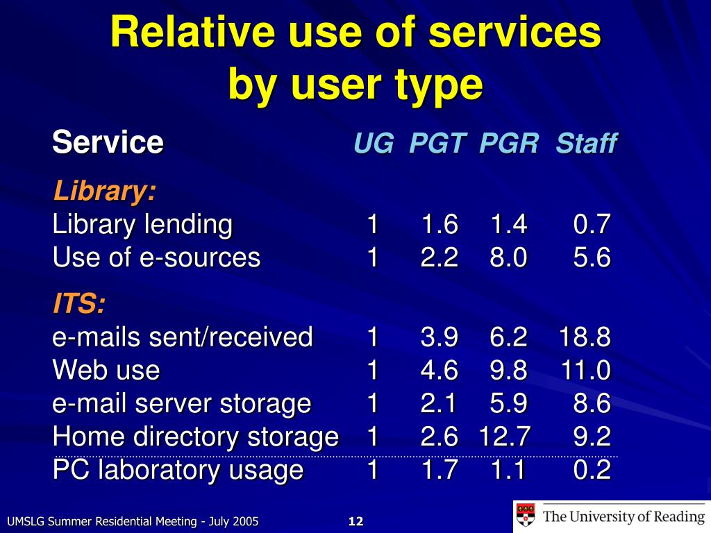 Relative use of services by user type Service UG PGT PGR Staff Library:Library lending 1 1.6 1.4 0.7Use of e-sources 1 2.2 8.0 5.6 ITS:e-mails sent/received 1 3.9 6.2 18.8Web use 1 4.6 9.8 11.0e-mail server storage 1 2.1 5.9 8.6Home directory storage 1 2.6 12.7 9.2PC laboratory usage 1 1.7 1.1 0.2