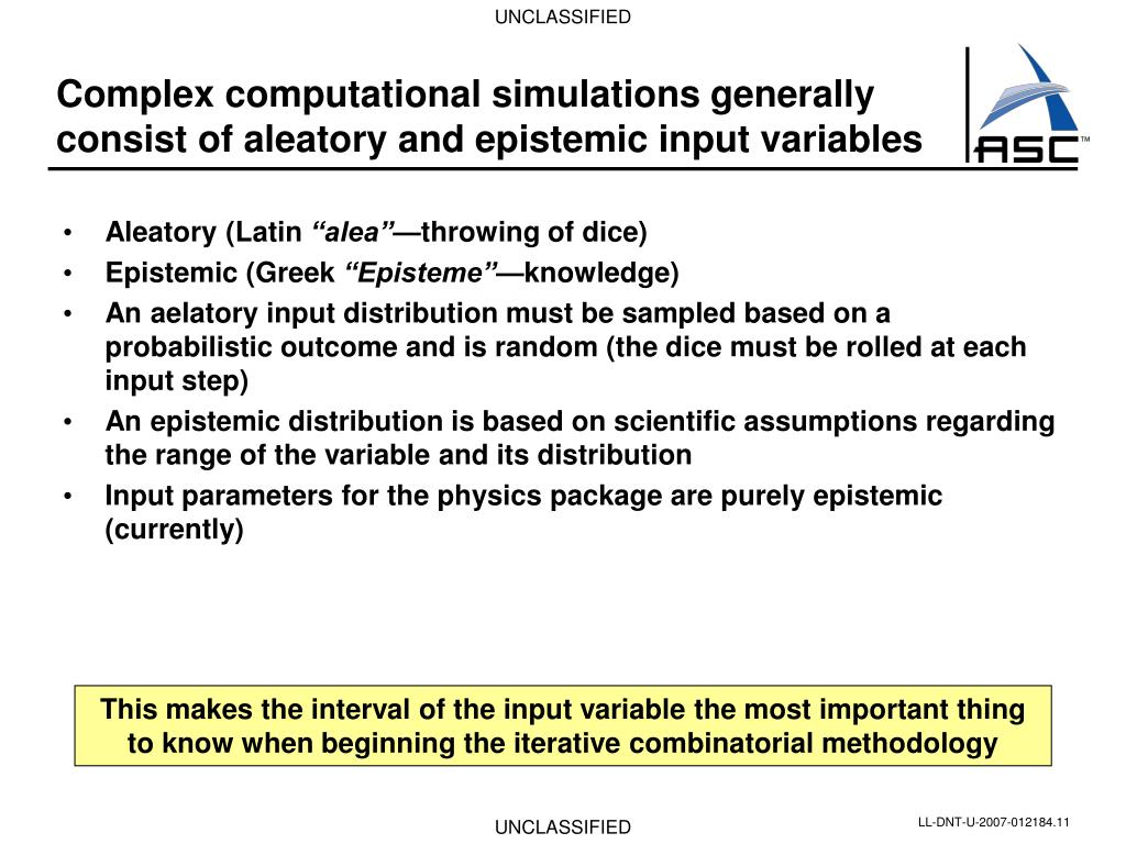 Complex computational simulations generally consist of aleatory and epistemic input variables • Aleatory (Latin “alea”—throwing of dice) • Epistemic (Greek “Episteme”—knowledge) • An aelatory input distribution must be sampled based on a probabilistic outcome and is random (the dice must be rolled at each input step) • An epistemic distribution is based on scientific assumptions regarding the range of the variable and its distribution • Input parameters for the physics package are purely epistemic (currently) This makes the interval of the input variable the most important thing to know when beginning the iterative combinatorial methodology