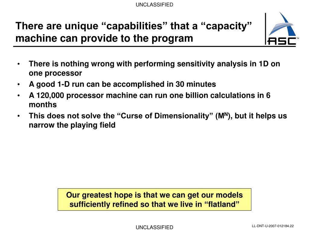 There are unique “capabilities” that a “capacity” machine can provide to the program • There is nothing wrong with performing sensitivity analysis in 1D on one processor • A good 1-D run can be accomplished in 30 minutes • A 120,000 processor machine can run one billion calculations in 6 months • This does not solve the “Curse of Dimensionality” (MN), but it helps us narrow the playing field Our greatest hope is that we can get our models sufficiently refined so that we live in “flatland”
