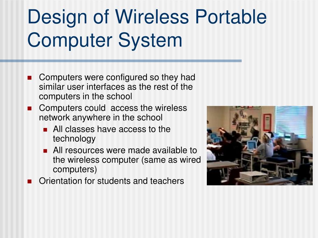 Design of Wireless Portable Computer System • Computers were configured so they had similar user interfaces as the rest of the computers in the school • Computers could access the wireless network anywhere in the school • All classes have access to the technology • All resources were made available to the wireless computer (same as wired computers) • Orientation for students and teachers
