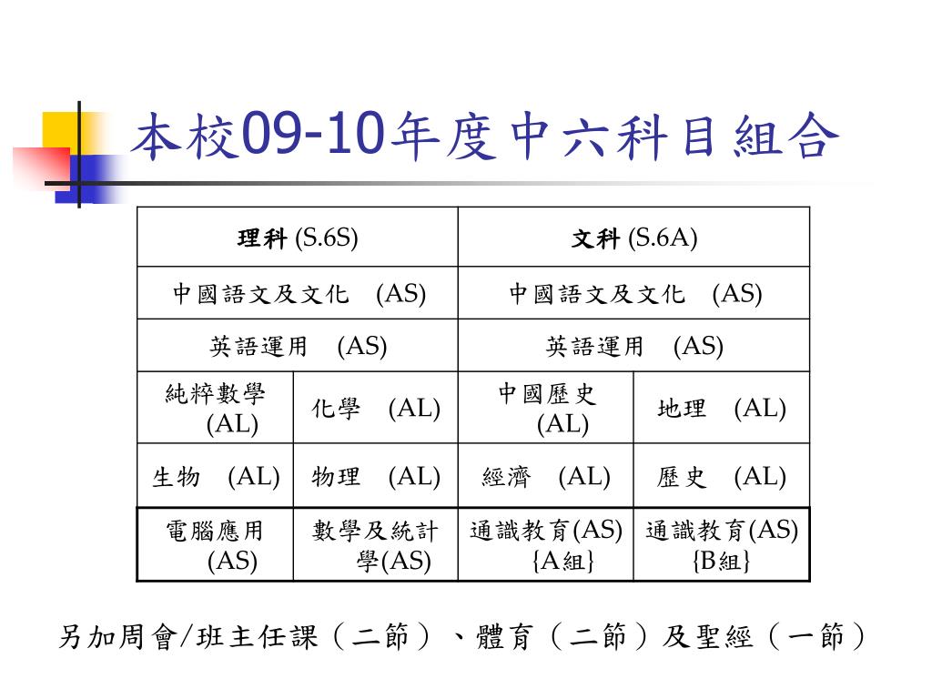 本校09-10年度中六科目組合 另加周會/班主任課(二節)、體育(二節)及聖經(一節)