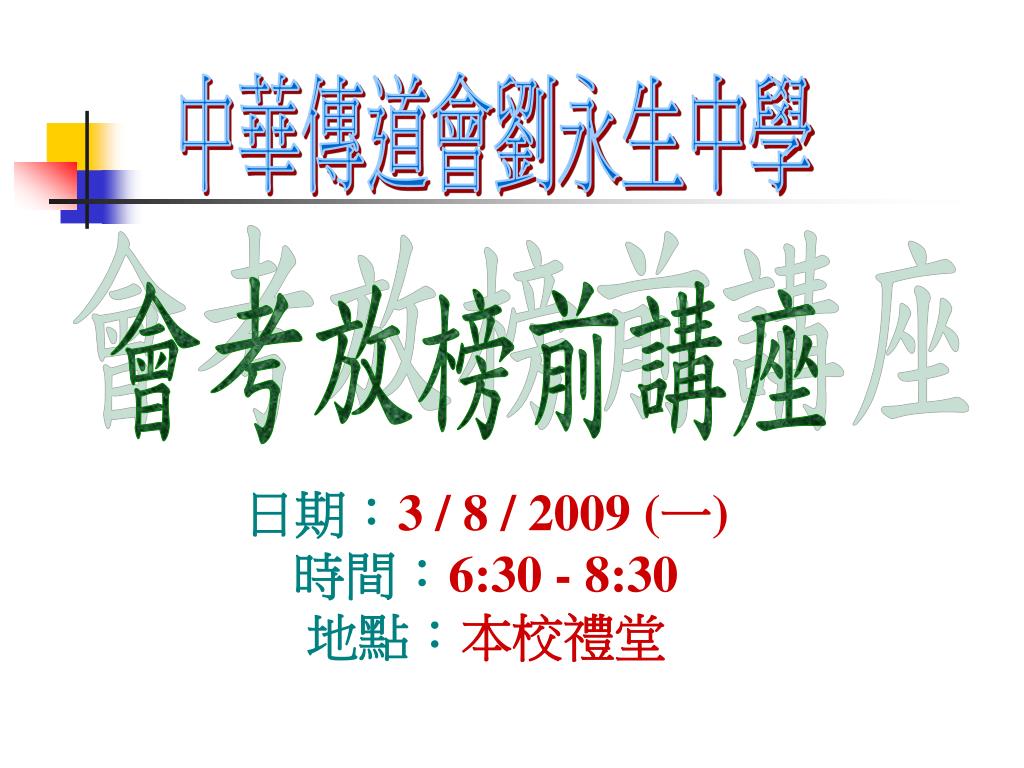 中華傳道會劉永生中學 會考放榜前講座 日期:3 / 8 / 2009 (一)時間:6:30 - 8:30 地點:本校禮堂