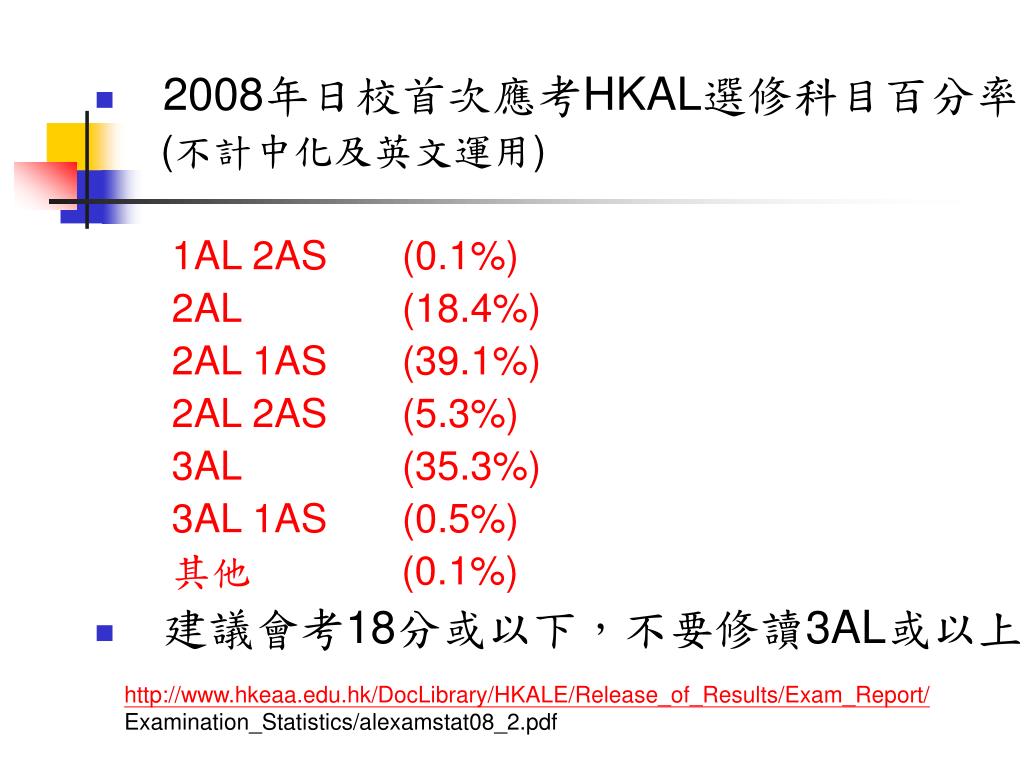 2008年日校首次應考HKAL選修科目百分率 (不計中化及英文運用) 1AL 2AS (0.1%) 2AL (18.4%) 2AL 1AS (39.1%) 2AL 2AS (5.3%) 3AL (35.3%) 3AL 1AS (0.5%) 其他 (0.1%) 建議會考18分或以下,不要修讀3AL或以上 http://www.hkeaa.edu.hk/DocLibrary/HKALE/Release_of_Results/Exam_Report/ Examination_Statistics/alexamstat08_2.pdf