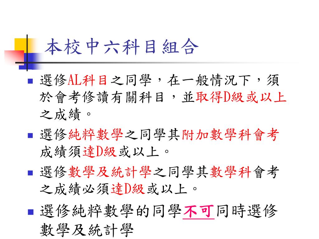 本校中六科目組合 • 選修AL科目之同學,在一般情況下,須於會考修讀有關科目,並取得D級或以上之成績。 • 選修純粹數學之同學其附加數學科會考成績須達D級或以上。 • 選修數學及統計學之同學其數學科會考之成績必須達D級或以上。 • 選修純粹數學的同學不可同時選修數學及統計學
