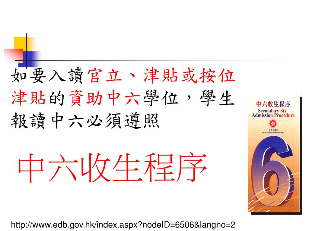 中六收生程序 如要入讀官立、津貼或按位津貼的資助中六學位,學生報讀中六必須遵照 http://www.edb.gov.hk/index.aspx?nodeID=6506&langno=2