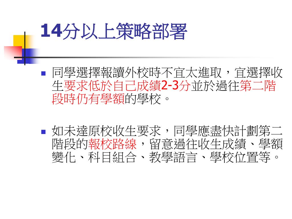 14分以上策略部署 同學選擇報讀外校時不宜太進取,宜選擇收生要求低於自己成績2-3分並於過往第二階段時仍有學額的學校。 如未達原校收生要求,同學應盡快計劃第二階段的報校路線,留意過往收生成績、學額變化、科目組合、教學語言、學校位置等。
