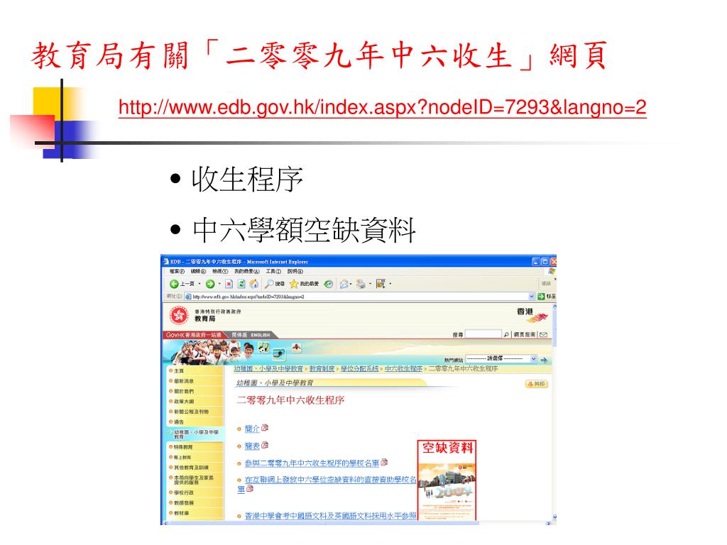 教育局有關「二零零九年中六收生」網頁 http://www.edb.gov.hk/index.aspx?nodeID=7293&langno=2 • 收生程序 • 中六學額空缺資料