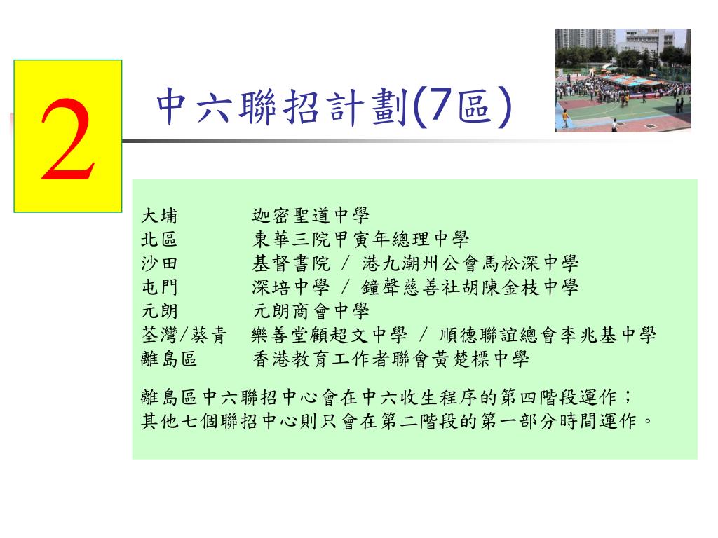 大埔 迦密聖道中學 北區 東華三院甲寅年總理中學 沙田 基督書院 / 港九潮州公會馬松深中學 屯門 深培中學 / 鐘聲慈善社胡陳金枝中學 元朗 元朗商會中學 荃灣/葵青 樂善堂顧超文中學 / 順德聯誼總會李兆基中學 離島區 香港教育工作者聯會黃楚標中學 離島區中六聯招中心會在中六收生程序的第四階段運作; 其他七個聯招中心則只會在第二階段的第一部分時間運作。 中六聯招計劃(7區) 2