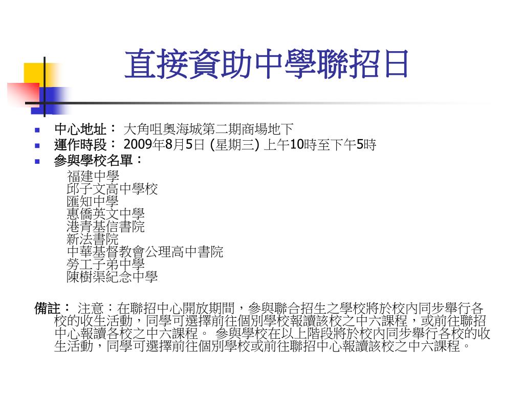 直接資助中學聯招日 • 中心地址: 大角咀奧海城第二期商場地下 • 運作時段:2009年8月5日 (星期三) 上午10時至下午5時 • 參與學校名單: 福建中學 邱子文高中學校 匯知中學 惠僑英文中學 港青基信書院 新法書院 中華基督教會公理高中書院 勞工子弟中學 陳樹渠紀念中學 備註: 注意:在聯招中心開放期間,參與聯合招生之學校將於校內同步舉行各校的收生活動,同學可選擇前往個別學校報讀該校之中六課程,或前往聯招中心報讀各校之中六課程。 參與學校在以上階段將於校內同步舉行各校的收生活動,同學可選擇前往個別學校或前往聯招中心報讀該校之中六課程。