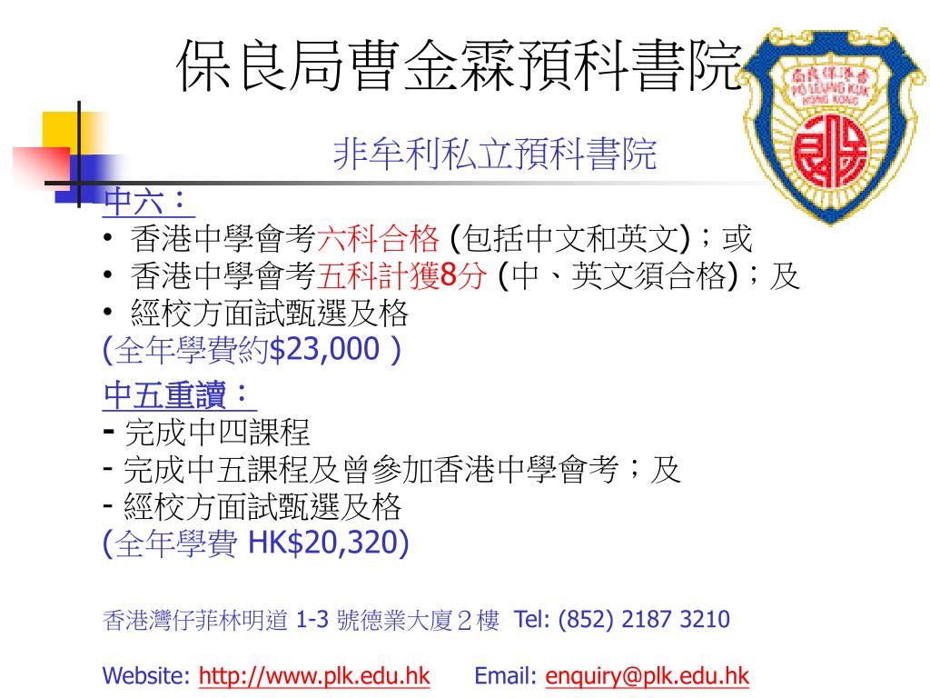 保良局曹金霖預科書院 非牟利私立預科書院 中六: • • 香港中學會考六科合格(包括中文和英文);或 • • 香港中學會考五科計獲8分(中、英文須合格);及 • • 經校方面試甄選及格 • (全年學費約$23,000 ) 中五重讀: • - 完成中四課程 • - 完成中五課程及曾參加香港中學會考;及 • 經校方面試甄選及格 • (全年學費 HK$20,320) • 香港灣仔菲林明道 1-3 號德業大廈2樓 Tel: (852) 2187 3210 • Website: http://www.plk.edu.hk Email: enquiry@plk.edu.hk