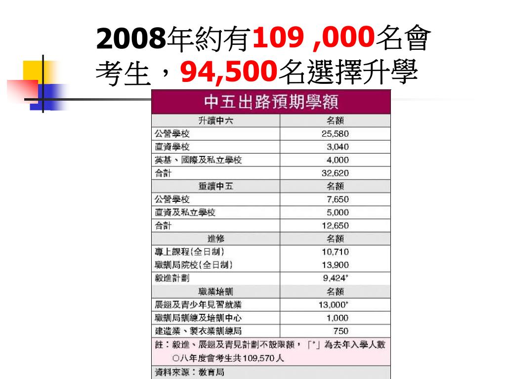 中華傳道會劉永生中學. 會考放榜前講座. 日期: 3 / 8 / 2009 ( 一 ) 時間: 6:30 - 8:30 地點: 本校禮堂. 中五生出路. 雙 待. 就 業. 升 學. 2008 年約有 109 ,000 名會考生, 94,500 名選擇升學. 官津資助中六學額: 約 25,600 直資 + 私立中六學額: 約 3,000+ 約 4,000 所有中六學額總數量: 約 32,620 2008 年會考應考人數: 109,574 ( 總報名人數 ) 應考 6 科或以上人數: 83,567