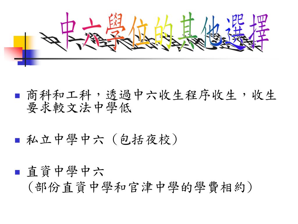 商科和工科,透過中六收生程序收生,收生要求較文法中學低商科和工科,透過中六收生程序收生,收生要求較文法中學低 私立中學中六 (包括夜校) 直資中學中六 (部份直資中學和官津中學的學費相約) 中六學位的其他選擇
