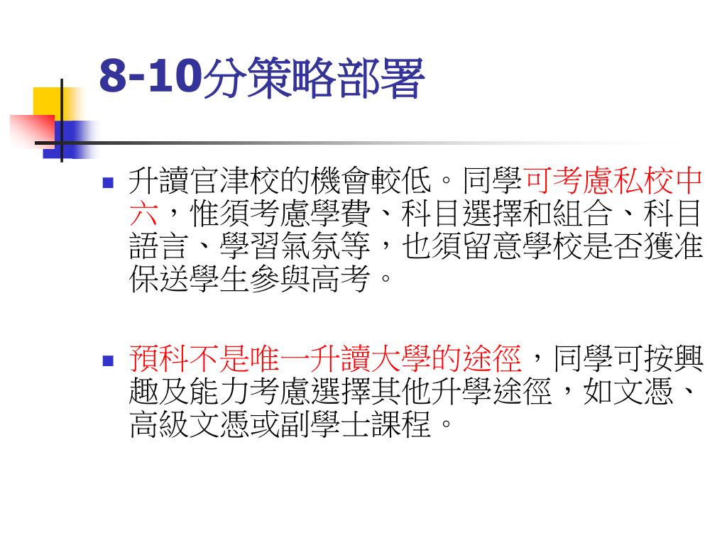 8-10分策略部署 升讀官津校的機會較低。同學可考慮私校中六,惟須考慮學費、科目選擇和組合、科目語言、學習氣氛等,也須留意學校是否獲准保送學生參與高考。 預科不是唯一升讀大學的途徑,同學可按興趣及能力考慮選擇其他升學途徑,如文憑、高級文憑或副學士課程。