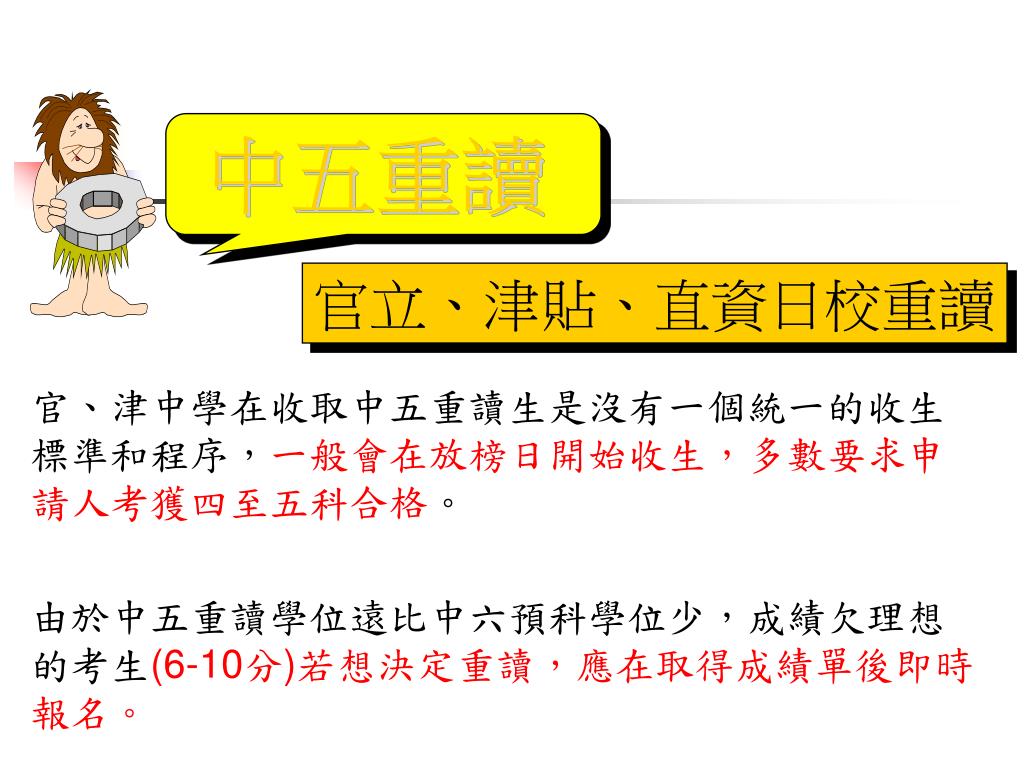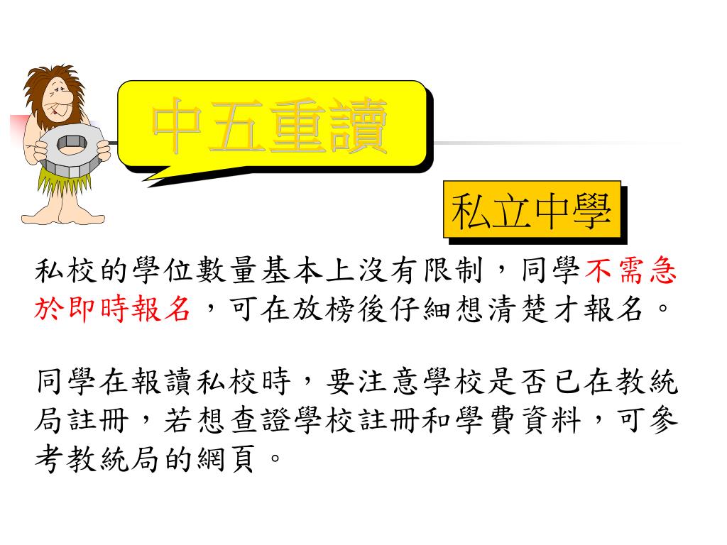 私校的學位數量基本上沒有限制,同學不需急於即時報名,可在放榜後仔細想清楚才報名。私校的學位數量基本上沒有限制,同學不需急於即時報名,可在放榜後仔細想清楚才報名。 同學在報讀私校時,要注意學校是否已在教統局註冊,若想查證學校註冊和學費資料,可參考教統局的網頁。 中五重讀 私立中學
