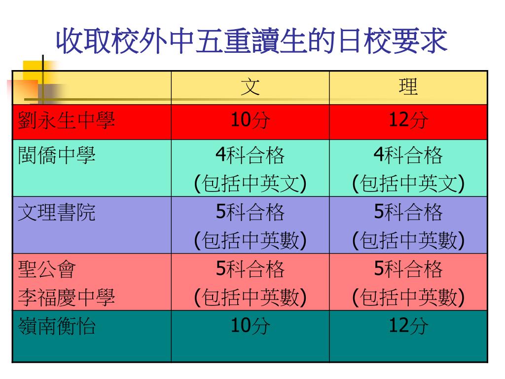 官、津中學在收取中五重讀生是沒有一個統一的收生標準和程序,一般會在放榜日開始收生,多數要求申請人考獲四至五科合格。官、津中學在收取中五重讀生是沒有一個統一的收生標準和程序,一般會在放榜日開始收生,多數要求申請人考獲四至五科合格。 由於中五重讀學位遠比中六預科學位少,成績欠理想的考生(6-10分)若想決定重讀,應在取得成績單後即時報名。 中五重讀 官立、津貼、直資日校重讀