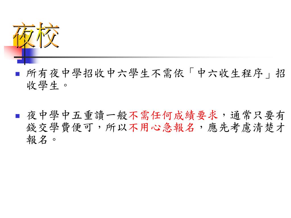 所有夜中學招收中六學生不需依「中六收生程序」招收學生。所有夜中學招收中六學生不需依「中六收生程序」招收學生。 夜中學中五重讀一般不需任何成績要求,通常只要有錢交學費便可,所以不用心急報名,應先考慮清楚才報名。 夜校