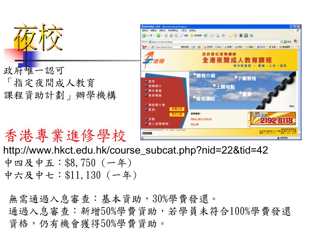夜校 政府唯一認可 「指定夜間成人教育 課程資助計劃」辦學機構 香港專業進修學校 http://www.hkct.edu.hk/course_subcat.php?nid=22&tid=42 中四及中五:$8,750 (一年) 中六及中七:$11,130 (一年) 無需通過入息審查:基本資助,30%學費發還。 通過入息審查:新增50%學費資助,若學員未符合100%學費發還資格,仍有機會獲得50%學費資助。