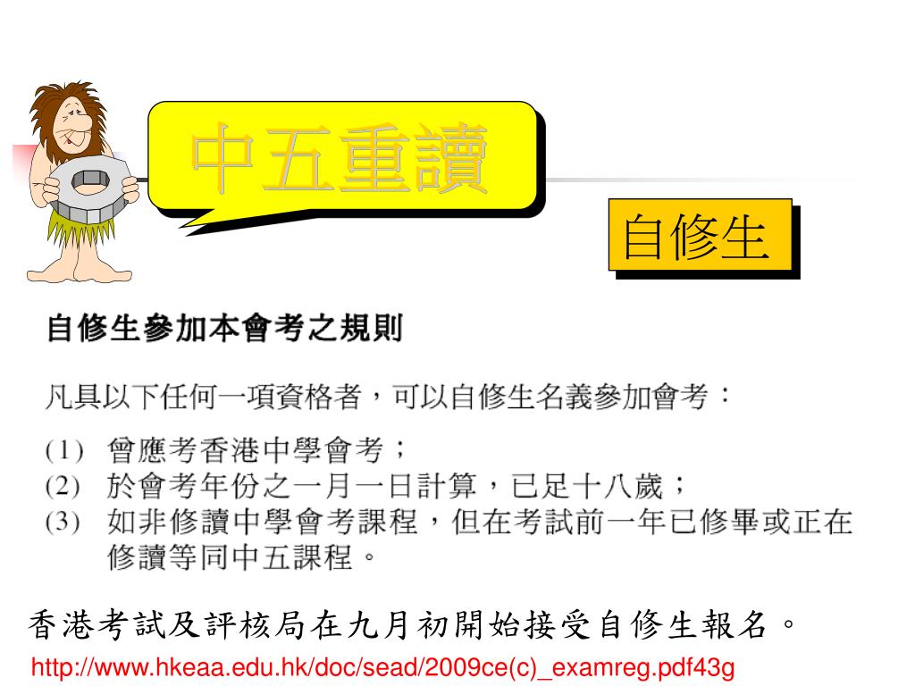 香港考試及評核局在九月初開始接受自修生報名。香港考試及評核局在九月初開始接受自修生報名。 中五重讀 自修生 http://www.hkeaa.edu.hk/doc/sead/2009ce(c)_examreg.pdf43g