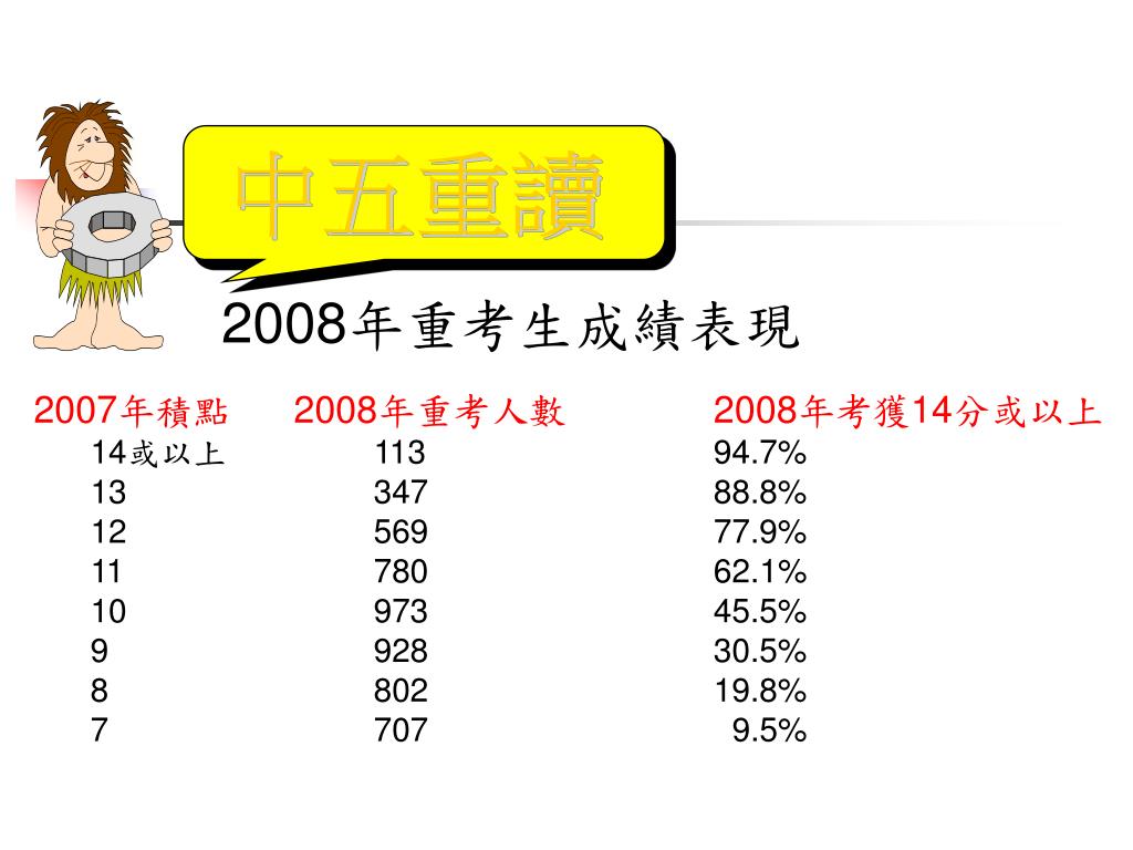 2007年積點 2008年重考人數 2008年考獲14分或以上 14或以上 113 94.7% 13 347 88.8% 12 569 77.9% 11 780 62.1% 10 973 45.5% 9 928 30.5% 8 802 19.8% 7 707 9.5% 中五重讀 2008年重考生成績表現